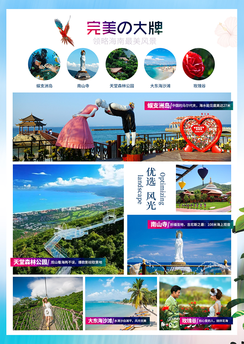 優選景區:蜈支洲5A|南山5A|天堂森林公園|玫瑰谷|拉斯維加斯大型表演秀丨健康生活館|跨境保稅商品體驗城丨大東海沙灘;